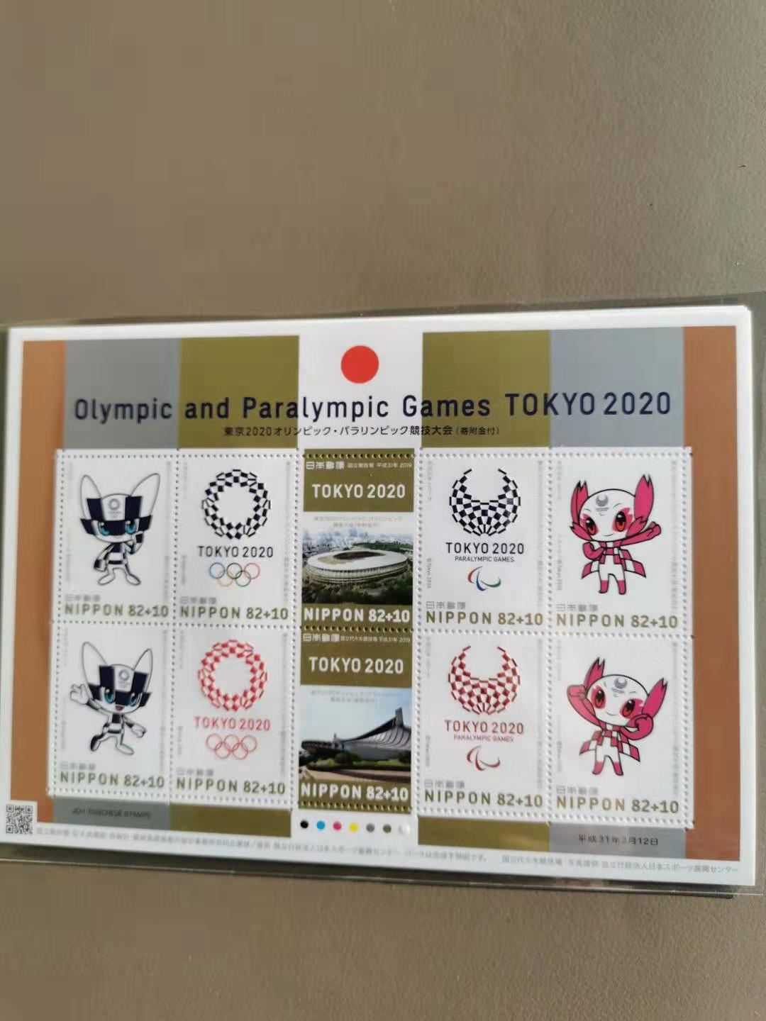.2020年日本东京奥运会和残奥会小全张(一)含IO票,由奥运会吉祥物Miraiowa"未来"和残奥会吉祥物Someity"永远"及会徽组成,中间是新的奥林匹克体育场