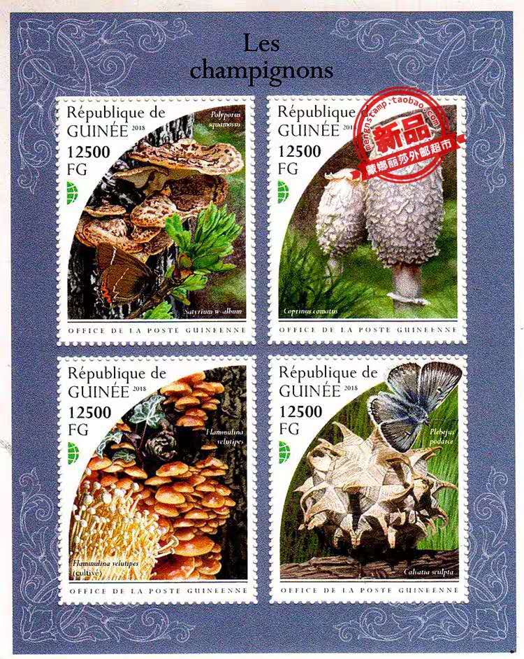 几内亚2018年珍稀植物小全张含4票真菌蘑菇,宽鳞多孔菌,蝴蝶乌酒灰蝶菌。