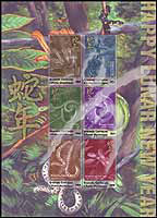 蛇年生肖,黄环林蛇、锦蛇、亚马逊树蚺、中国绿树蝰等及中文书法“蛇年”小版张(含6票)