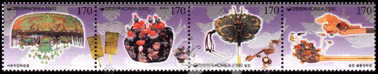 韩国之美系列十—韩国妇女传统头饰,饰有金玉镶花的龟壳梳子、蝴蝶发夹、龙形帽巾及翠玉凤形发夹4联