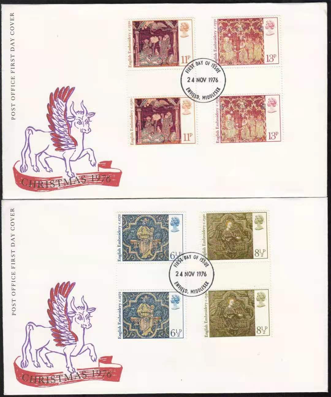 英国1976年圣诞节—教堂壁画(2封8票)首日实寄封