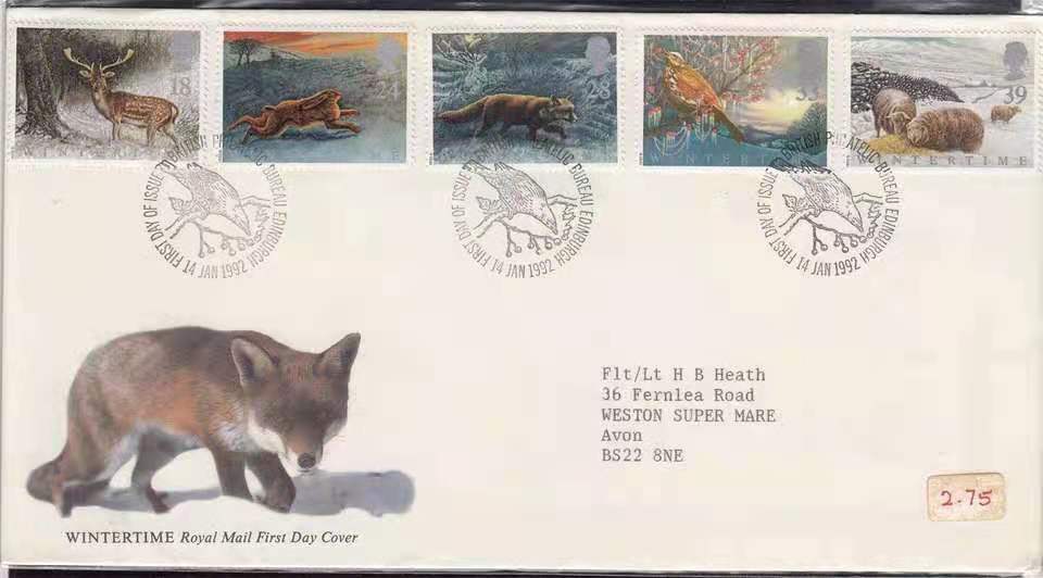 英国1992年冬季田野中的动物鹿羊狼兔(5票全)首日实寄封