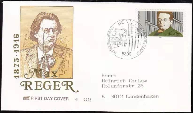 徳国1991年管风琴作曲家雷格尔邮票首日实寄封
