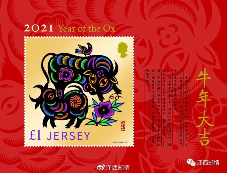 泽西2021年发行生肖牛小型张1全,邮票图案由中国著名邮票设计家王虎鸣设计,釆用中国剪纸和绘画手法,生动形象地展示“老牛舐犊”的温馨画面。