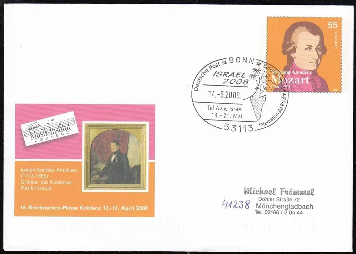 德国2008年科布伦茨音乐学院200年创始人邮资—莫扎特邮资封实寄