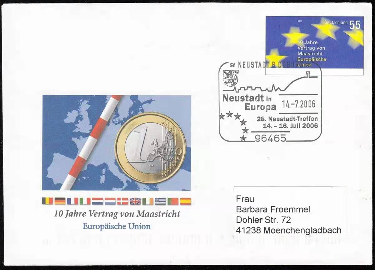 德国2003年欧元和欧盟各国国旗邮资封实寄