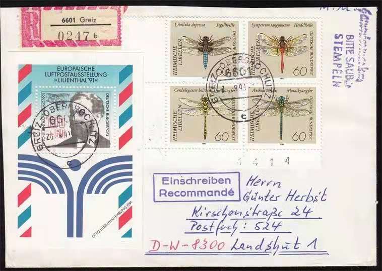 德国1991年昆虫—蜻蜓(4方连邮票)和滑翔机之父奥托·李林塔尔小型张首日挂号实寄封