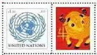 联合国2021年生肖牛个性化邮票,联合国徽志1全,附票为剪纸花牛