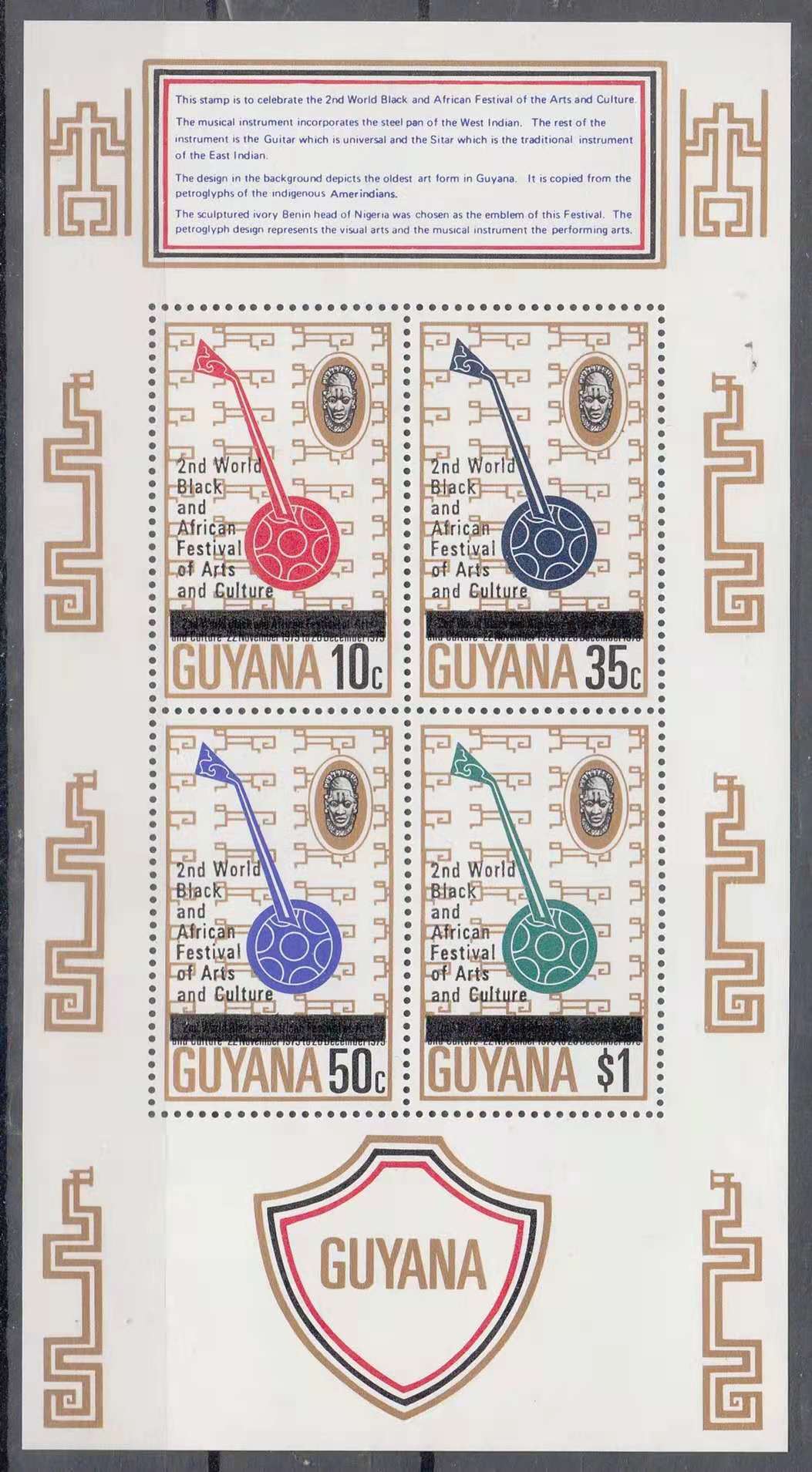 圭亚那1977年第二屆非洲和黑人艺术节―乐器等小全张,含4票。