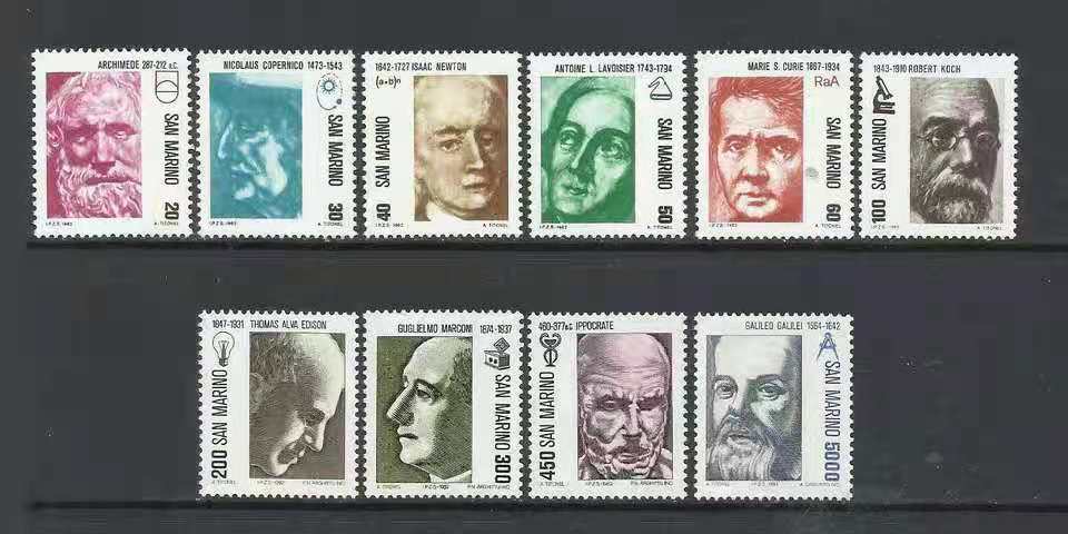 圣马力诺1982年著名科学家(1)科赫,哥白尼,牛顿,居里夫人等邮票10全