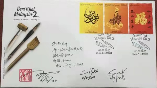 马来西亚2020年生肖鼠―书法邮票3全首日实寄封,有汉字“福”和人喜盛世,鼠兆丰年三位邮票设计者签名。