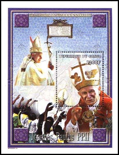 教皇保罗二世出访世界各地,手握权杖及挥手场景小型张