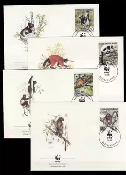 马达加斯加1988年WWF狐猴,世界野生动物基金会徽志首日封(4封4票全)