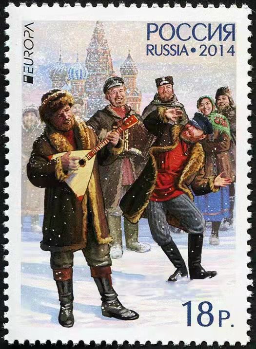 俄罗斯2014年欧罗巴―民族乐器1全图案为民间节日场景唱歌跳舞演奏三弦琴