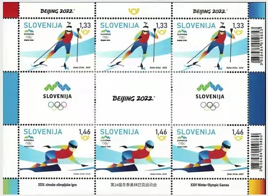 斯洛文尼亚2022年北京冬奥会邮票小版张含3套6票中间过桥“BEIJING2022”两枚票均有一名滑雪比赛运动员