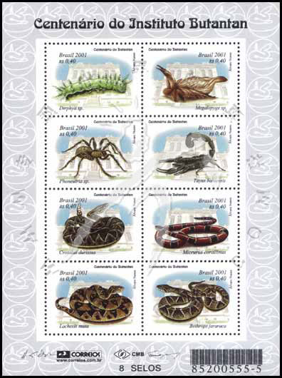 巴西布坦坦研究所成立百年,蜘蛛、蝎子、蛇、美丽珊瑚蛇、巨蝮、美洲矛头蝮蛇及昆虫等小版张(8票)