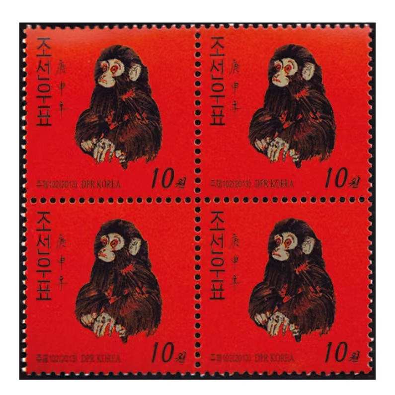 邮票介绍:朝鲜2013年发行中国1980年生肖金猴(原版)邮票4方联