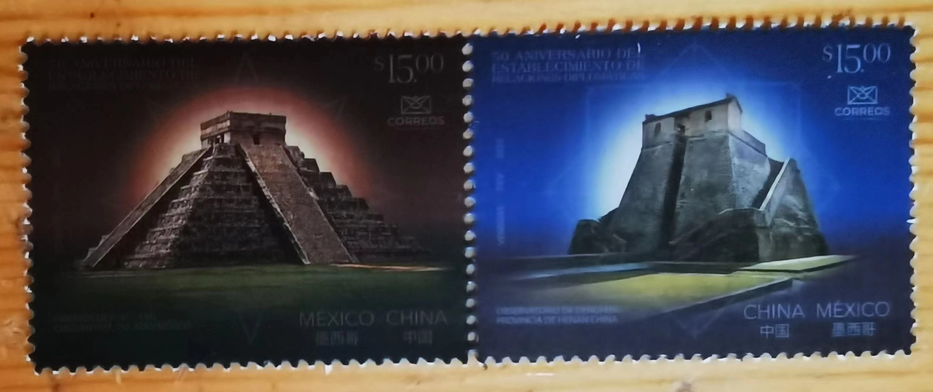 墨西哥2022年与中国建交50周年联合发行天文邮票2全河南登封观星台和库库尔坎金字塔