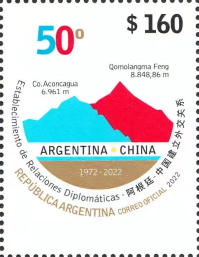 阿根庭2022年与中国建交50周年发行珠穆朗玛峰和阿空加瓜山邮票1全