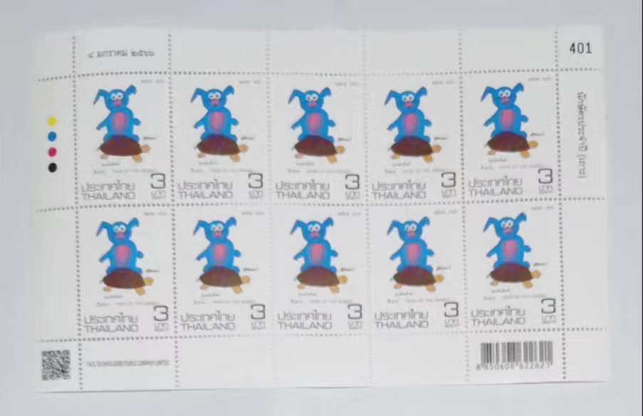 泰国2023年生肖兔邮票小版张(含10票),邮票上的卡通蓝色兔图案由诗琳通公主亲手绘制