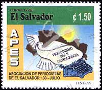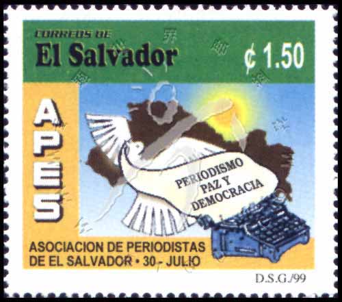 萨尔瓦多新闻记者协会会议,地图、打字机、和平鸽衔着号召和平、民主的信1全