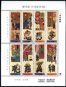 韩国之美系列九,屏风艺术“附图汉字”—“忠、孝、礼、仪、廉、耻”及装饰图案小版张(8票)