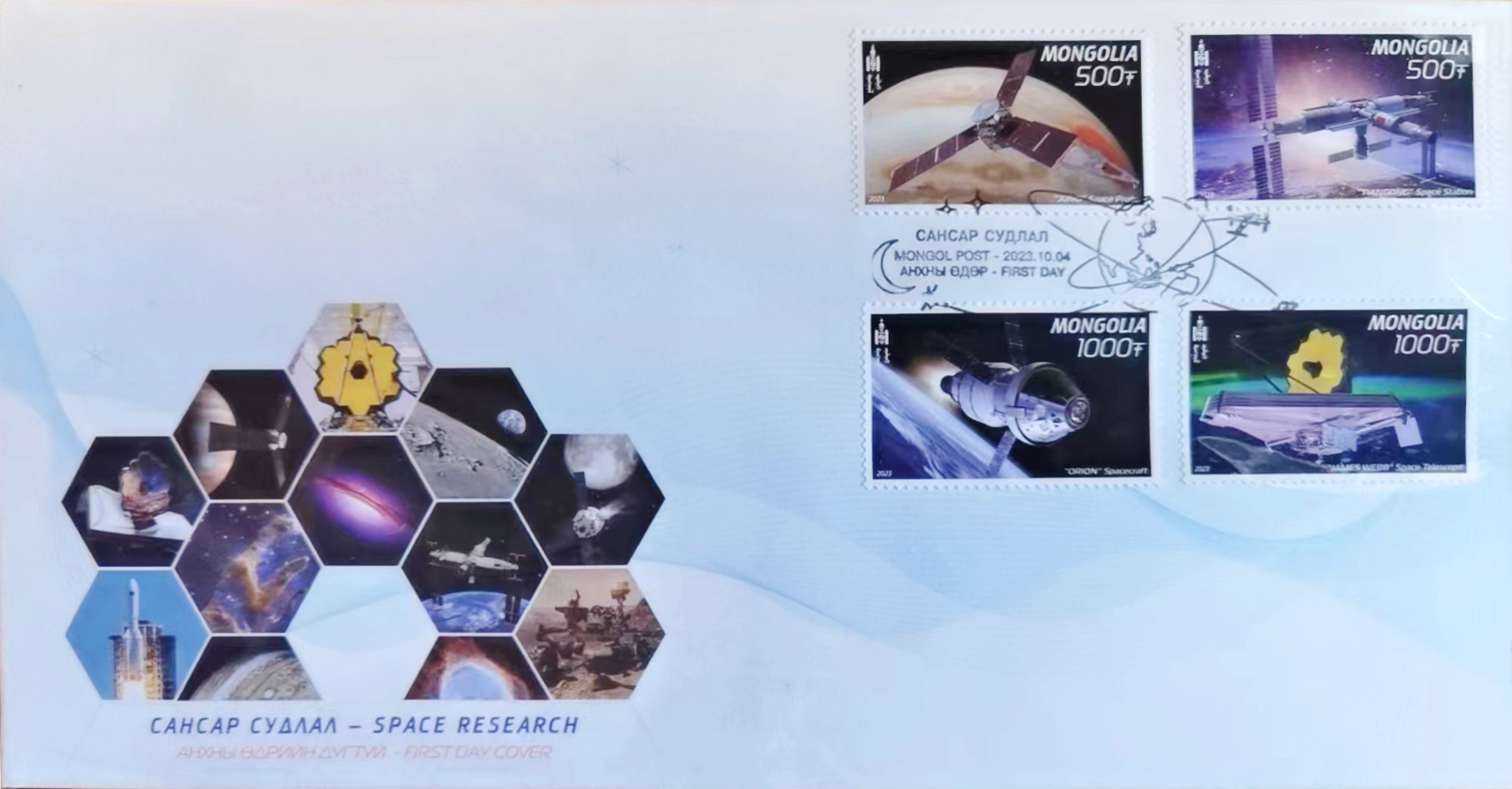 蒙古2023年发行航天邮票4全首日封,中国天宮1号,朱诺号木星探测器,猎户座太空飞船,詹姆斯韦伯深空望远镜等。