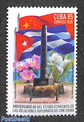 古巴2020年与中国建交60周年发行邮票1全两国国旗,国花,华人纪念碑
