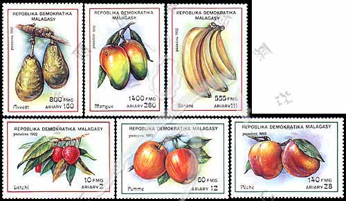 Sc#1064,1066-70 水果:荔枝、苹果、桃、香蕉、鳄梨及芒果1枚