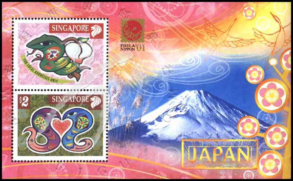 蛇年生肖,民间艺术蛇2001年日本国际邮展加盖小全张(2票)