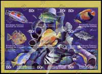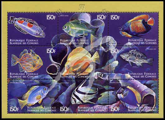 海洋鱼类系列二,鳃斑盔鱼、蓝光鳃鱼、黄高鳍刺尾鱼等小版张(9票)