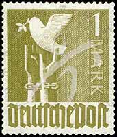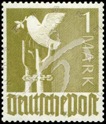 邮票介绍:Sc#574 德国向往和平,戴锁链的双手托着和平鸽普票1m 1枚
