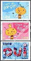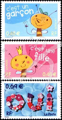 问候邮票,蜂王(代表女孩)、工蜂(代表男孩)、鲜花拼成的“OUI (Yes)”等3全