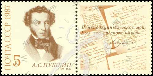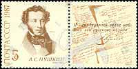 Sc#5566 俄国诗人普希金(1799-1837)逝世150周年(带附票)5k 1全