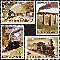 希铁路百年,蒸汽机车和客车穿越皮立翁山、帕帕德亚桥上的机车和货车、比雷埃夫斯·伯罗奔尼撒机车、卡拉夫里塔机车4全
