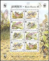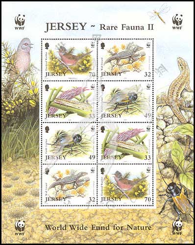 泽西岛珍稀动物,壁虎、蚁狮、蟋蟀、波纹林莺及WWF野生动物基金会徽志小版张(2套共8票)