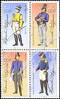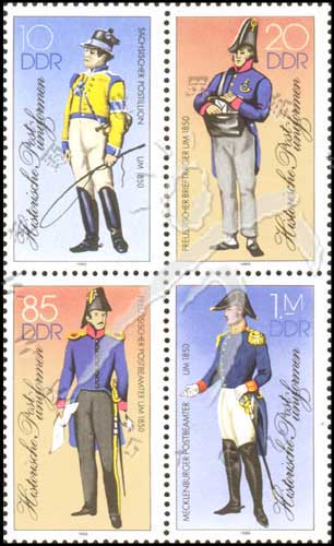历史邮政制服,萨克森邮政马车邮递、普鲁士信差、普鲁士邮局职员及梅克伦堡邮局职员4联