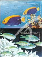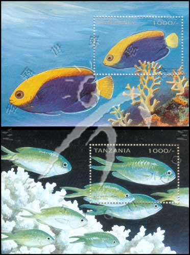 海洋生物,东非火背神仙及蓝绿光鳃雀鲷2枚小型张