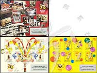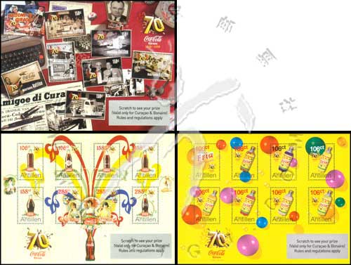 库拉索生产可口可乐70周年,可口可乐玻璃瓶、工厂大楼、宣传海报及其他果味饮料3枚小版张(各8票)