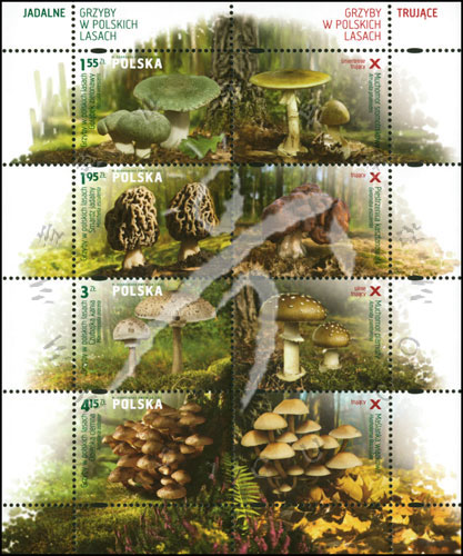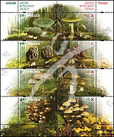 森林里的蘑菇,绿菇、羊肚菌、高大环柄菇及奥氏蜜环菌小版张(4票+4枚附票为毒鹅膏、鹿花菌、豹斑毒伞及簇生黄韧伞)