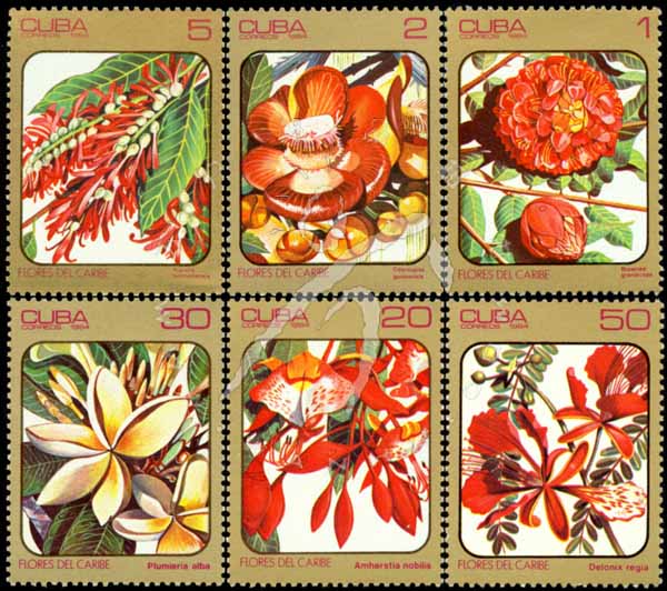 加勒比海花卉,大头宝冠木、炮弹花、蓼树、阿姆候斯铁、鸡蛋花及凤凰木6全