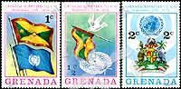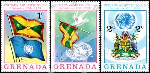 Sc#621-23 格林纳达加入联合国,UN徽志、格林纳达国旗国徽1枚