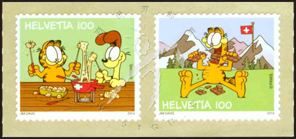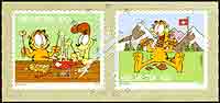 卡通《加菲猫》,加菲猫与小狗欧弟一起享用瑞士火锅及加菲猫坐在瑞士雪山下的草地上吃瑞士巧克力不干胶自贴票2全
