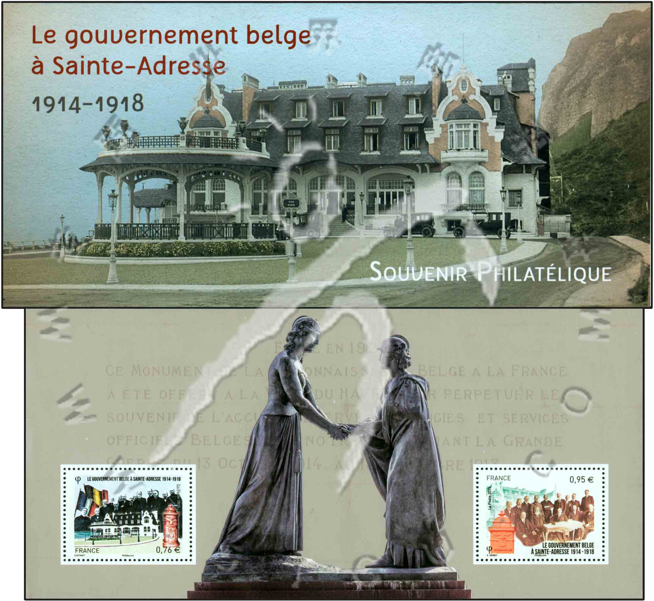 一战百年系列:比利时流亡法国的临时政府,政要合影、邮筒及建筑等邮折(内含1枚小全张,2票)