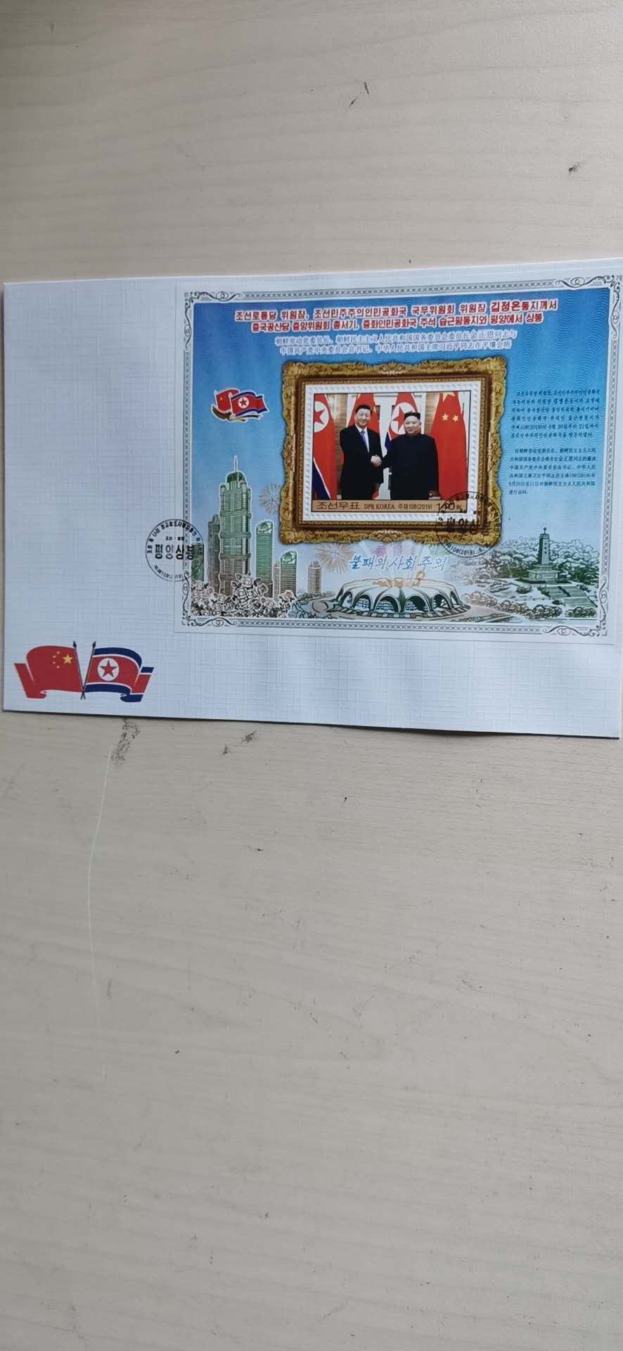 朝鲜2019年中朝首脑平壤会晤小型张首日封习近平和金正恩握手,两国国旗