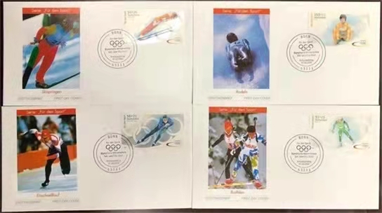 德国2002年美国盐湖城第19屆冬奧会五环,滑雪越野射击,速滑,高空跳雪及单人雪撬比赛首日封(4封全)