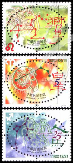 星座系列三,火象星座,白羊座、狮子座、人马座3全(椭圆形票)